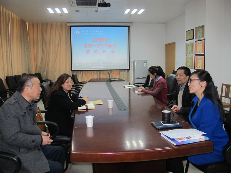 2015年4月14日上午10时,浙江省红十字会现场应急救护工作指导中心陈雨荣主任,培训中心王春香科长莅临我校护理系。此次,省红十字会领导主要是与张玲芝主任洽谈省救护培训班的培训等相关事宜。张主任作为省红十字会救护培训专家指导委员会委员,承担了救护培训的相关课程和教案设计等工作。洽谈会在博爱楼703会议室进行。