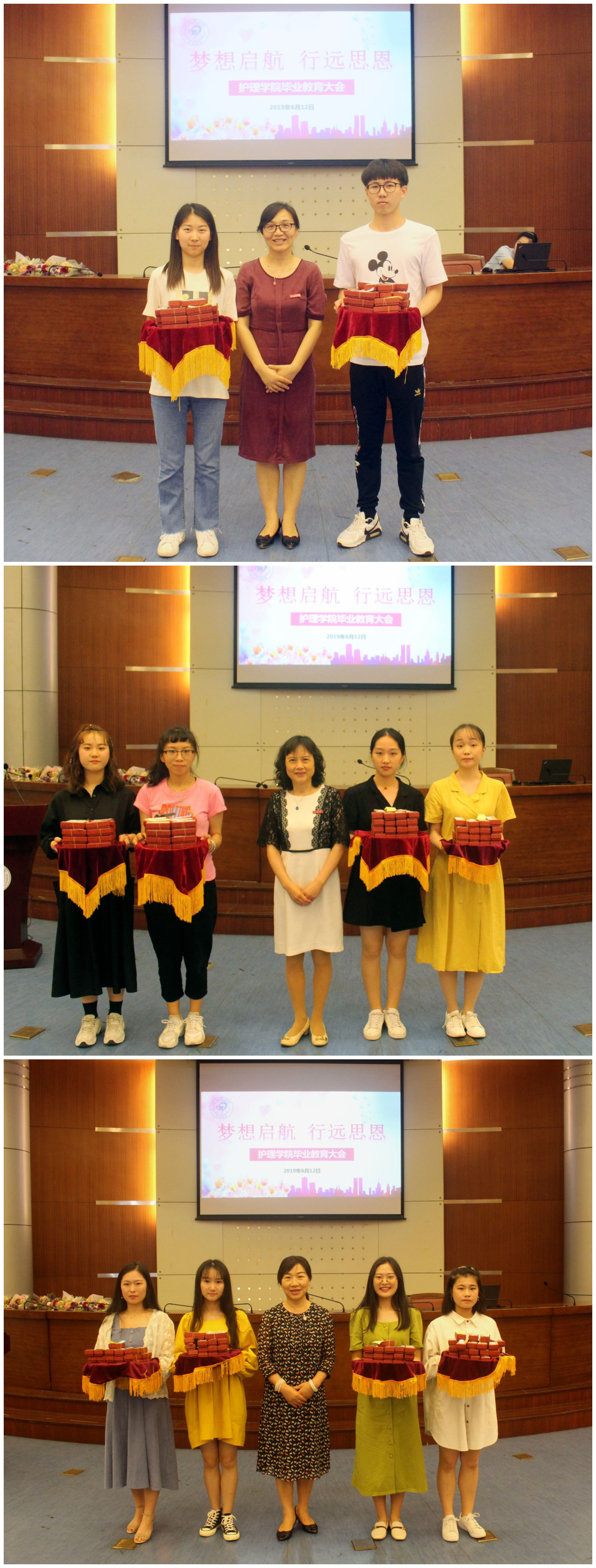 母校情重,师恩难忘,在这分别之际,全体毕业生也为学院准备了礼物,愿护理学院越来越好,愿母校繁荣昌盛!毕业生代表向院部献上刻有“不忘初心、方得始终”的纪念摆件,向班主任辅导员、全体教师献上鲜花与祝福。