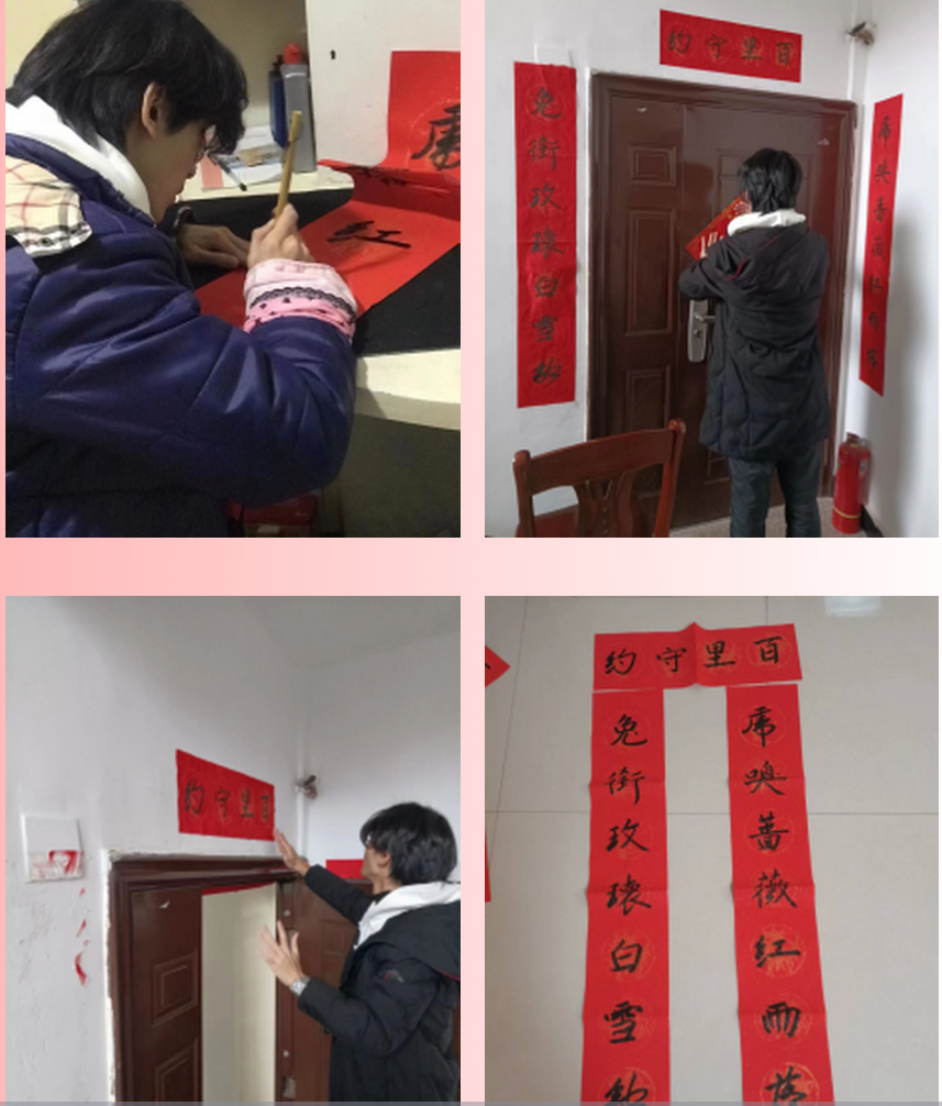 春联作为中国传统文化,历史悠久,影响深远。小小礼仪,亦有乾坤。贴春联的时间是在农历大年二十九涨潮时贴;书写格式为仄起平收;贴法为上联在右、下联在左、横批从左往右。今年我家的春联内容是虎嗅蔷薇红雨落,兔衔玫瑰白雪融,横批:百里守约。