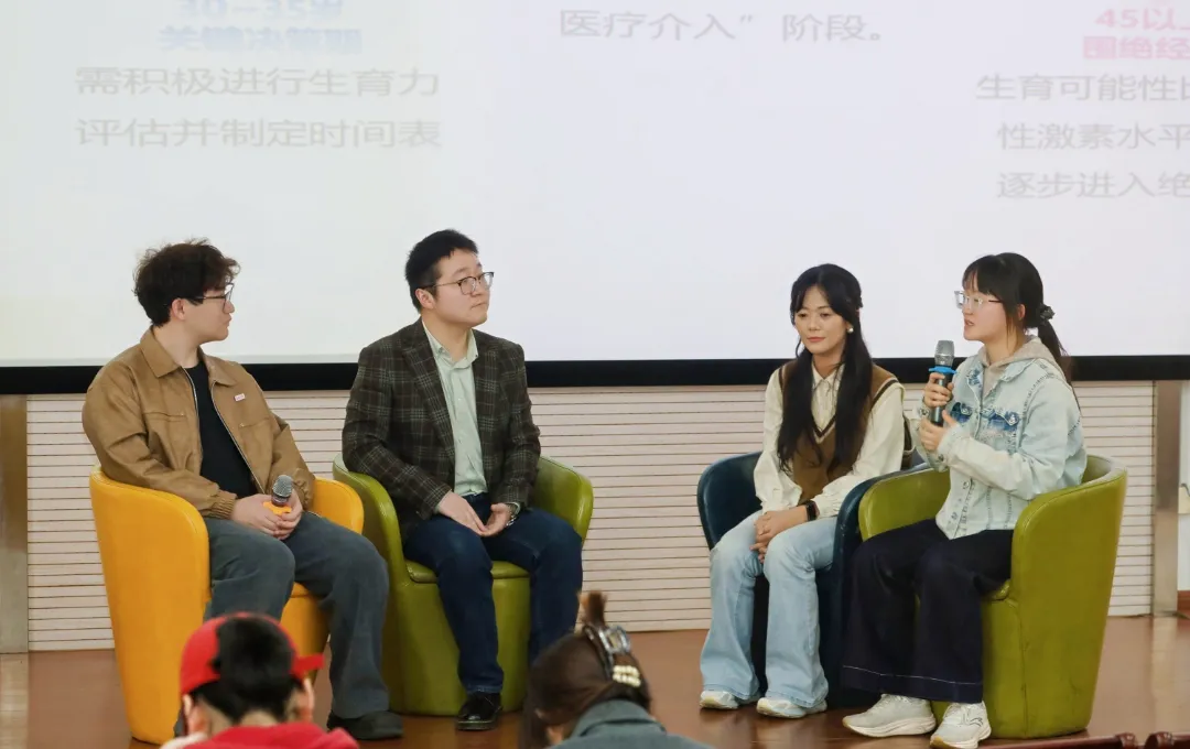 讲座结束后,杭州青年网络创始人何一奇、杭州医学院青春秘语协会熊维豪、刘晨以及杭州青年网络小伙伴们一起开展互动沙龙。现场,何老师通过趣味提问、话题探讨、经验分享等形式,与青年伙伴们一起探讨、回应学生关于生殖健康、恋爱交往、婚育规划等方面的困惑,进一步深化了学生对讲座内容的理解,营造了轻松愉悦、积极互动的交流氛围,让学生在交流中解惑、在探讨中提升。